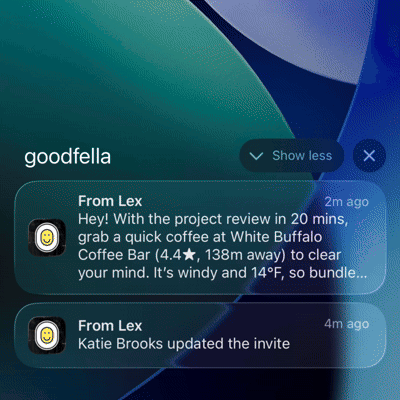 GoodFella learns your social preferences, energy patterns, and emotional needs. It understands when you thrive in groups versus when you need quiet time, recognizes your stress signals, and adapts to support your social wellness. Your mental health patterns, social energy cycles, and what brings you joy are always understood.